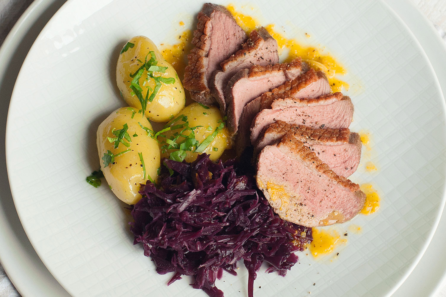 Rødvin: Côtes-du-Rhône og Languedoc rammer anden sikkert: varme frugtaromaer, krydderi og bløde tanniner, som binder både fedme og sprødhed sammen. De følger kødet uden at presse det.