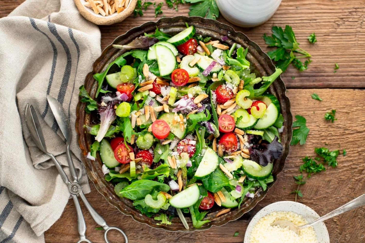 Hvidvin: Frisk, frugtig og aromatisk. Sauvignon Blanc for duft og urter; Muscadet for renhed og mineralitet; Riesling for sprødhed. Hvis salaten har ost eller bacon en blød Chardonnay uden for meget fad.