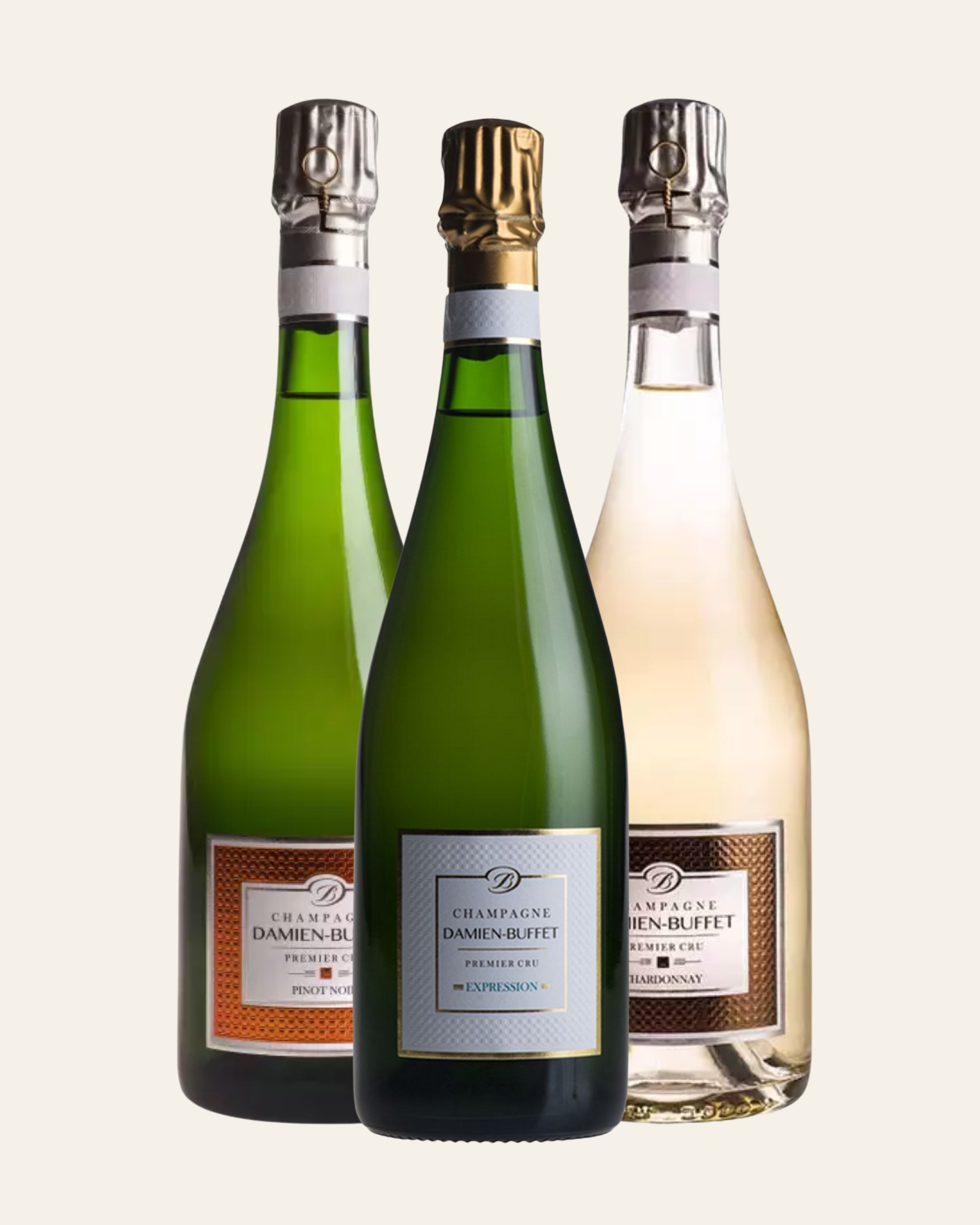 Eksklusivt trio-sæt fra Damien-Buffet: tre champagner, der hver viser en klassisk side af regionens druesorter og håndværk. Ét glas ren finesse med en Blanc de Blancs på Chardonnay, dybde og struktur i en Blanc de Noirs på Pinot Noir – og en tredje cuvée, der samler husets stil i et elegant udtryk. Et perfekt sæt til at smage bredden og præcisionen fra en af Champagne’s mest dedikerede små producenter.