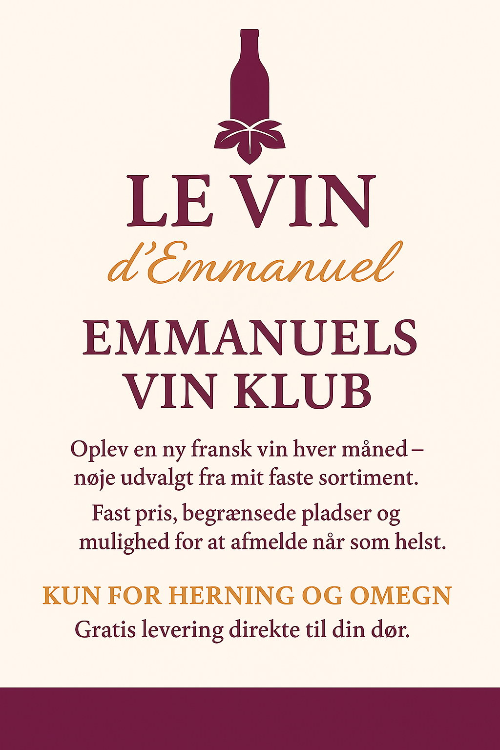Du får en enkel og fleksibel løsning: én fast pris om måneden, ingen binding og mulighed for at afmelde når som helst. Levering sker lokalt i Herning og omegn, så du får din vin direkte til døren uden ekstra omkostninger.