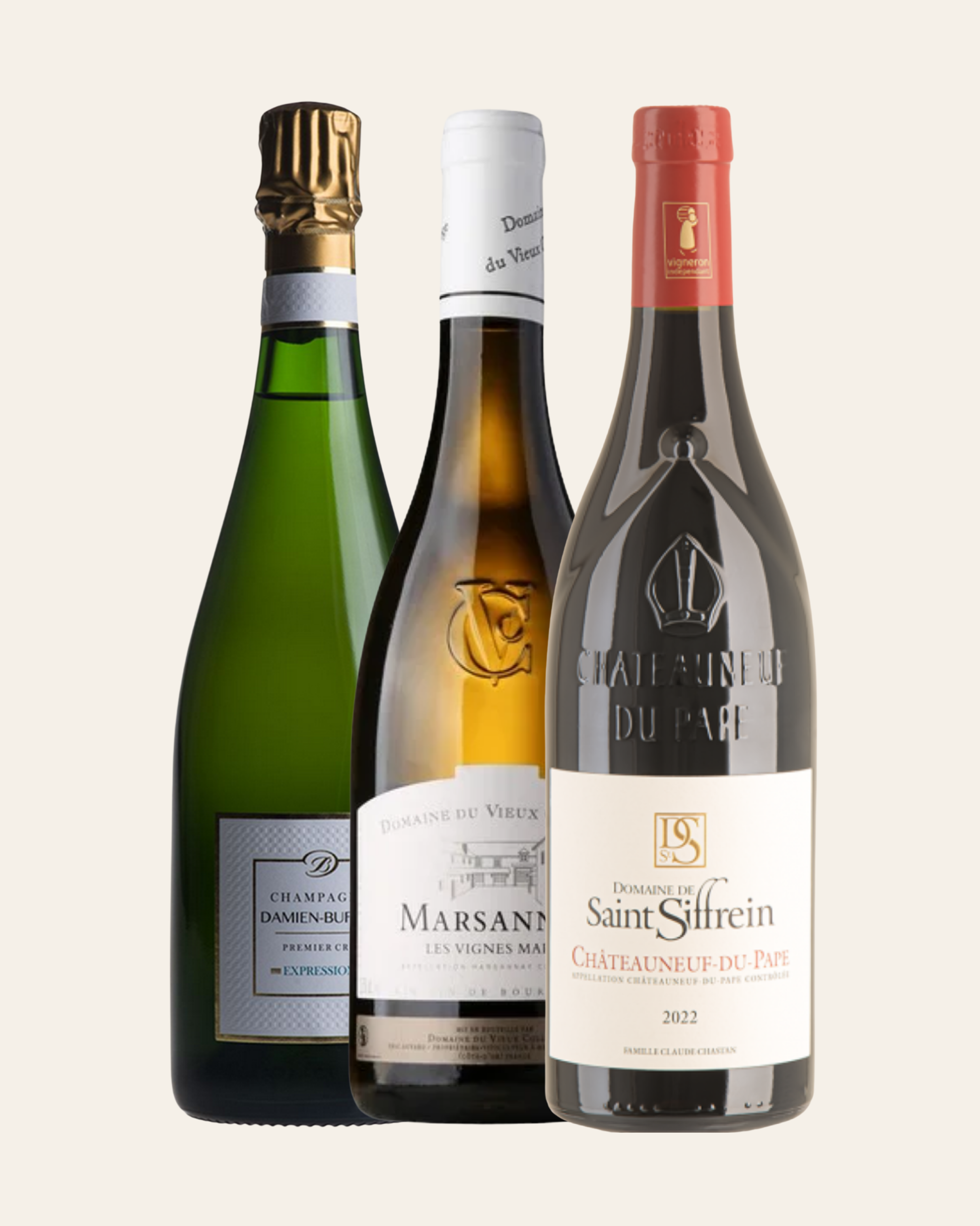 Trio - Prestige er en kasse til dig, der vil have lidt af det hele - bare på et niveau over det sædvanlige. Champagne til at åbne aftenen med elegance, en raffineret hvidvin til maden og en stor rødvin til at afslutte i stil - alt samlet i én eksklusiv prestige-kasse. Du får en sprød og fintperlende Champagne, en aromatisk og mineralsk hvid Bourgogne med ren finesse og en dyb, silkeblød Châteauneuf-du-Pape med stor kompleksitet. Tre stilarter og tre terroirs, der tilsammen giver en helstøbt, luksuriøs smageoplevelse.