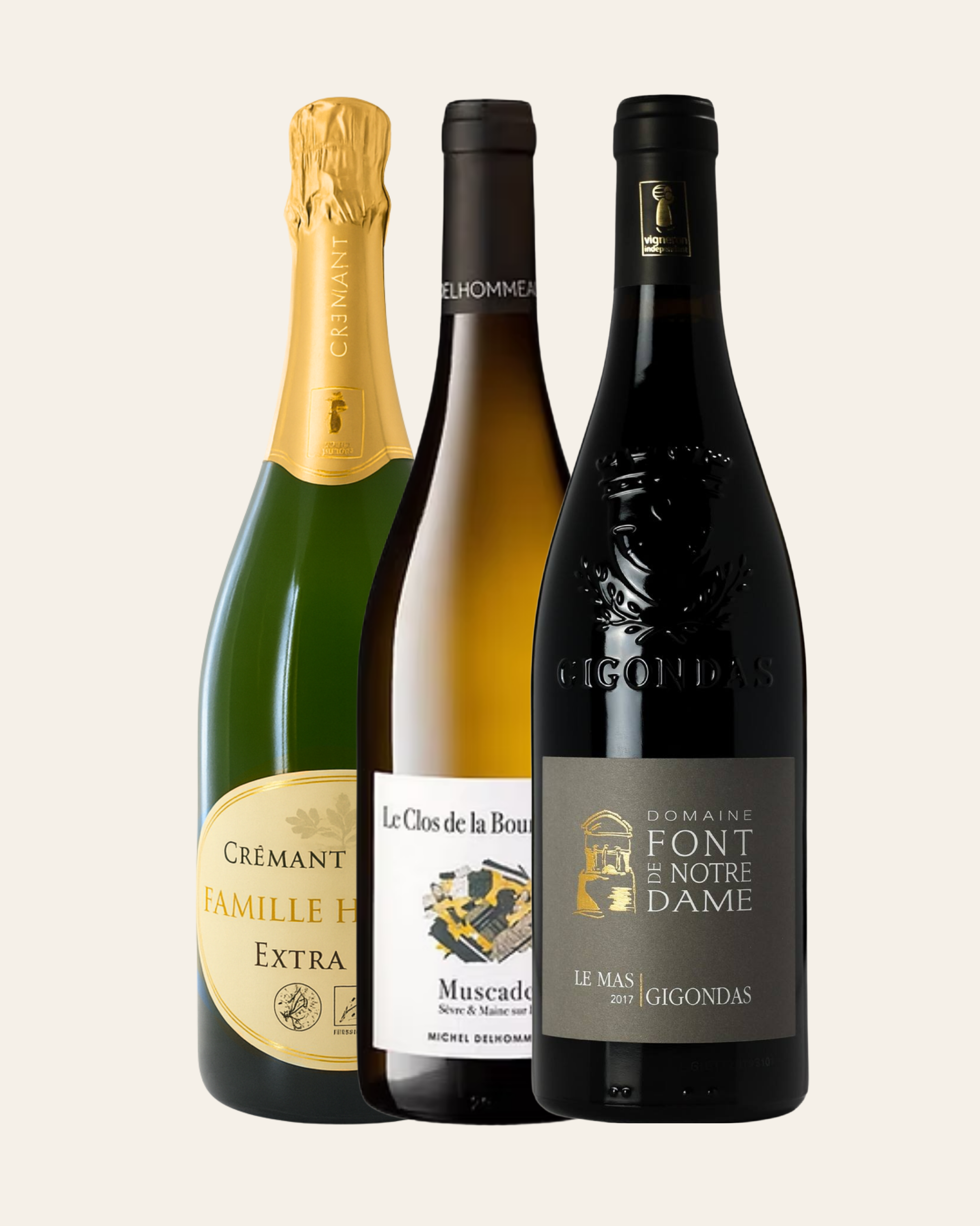 Trio – value er en afslappet og let smagekasse med tre vine, der giver dig en god og varieret oplevelse. Du får sprøde bobler til hygge, en frisk og aromatisk Muscadet til mad – og en kraftige og saftig sydrhône rødvin med masser af charme perfekt til julemad. Tre forskellige stilarter, tre favoritter, samlet i én kasse til en fair pris. Perfekt til weekenden, særlige øjeblikke – eller når du vil forkæle dig selv med noget godt uden at sprænge budgettet.